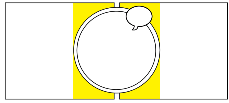 If you, like me, enjoy doing dynamic page layouts for your comic, you will need to set some ground rules for yourself. For example, I still enjoy using a floating panel between two larger panels. Still, when I do so now, I'm sure to avoid placing text or important visual information in the immediate vicinity (see the yellow zone below). Visuals in that area tend to make for awkward crops.